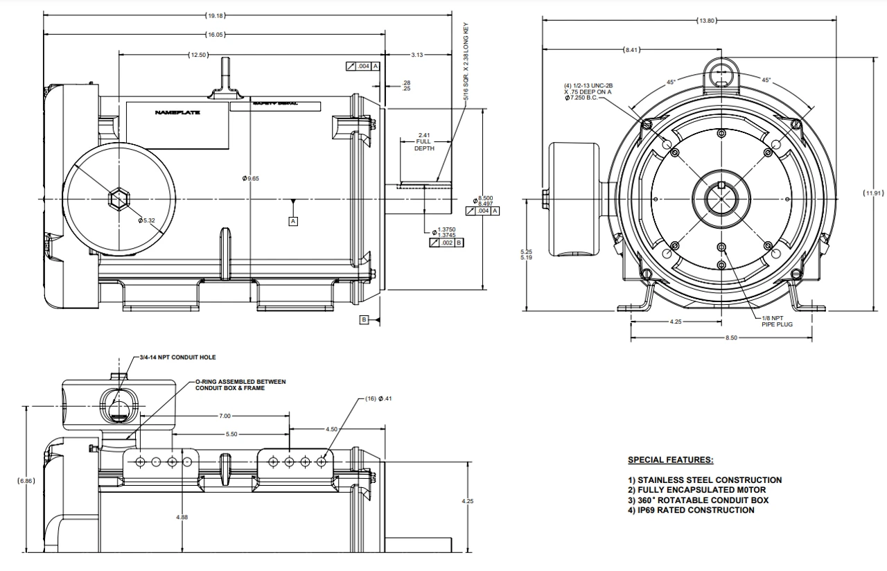- NEMA 213TC frame, C-face, Stainless Steel Keyed Shaft 1 3/8″ Diameter x 3 1/8″