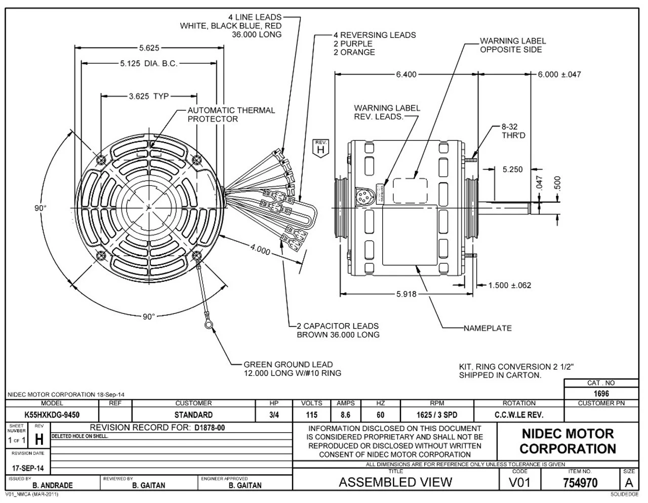 Permanent Split Capacitor Motor. Automatic Overload Protection. Continuous Duty; Open Air Over Enclosure; Class B Insulation; 40C Ambient Temperature; 36″ Leads, 60 Hertz. K055KDG9450022B.