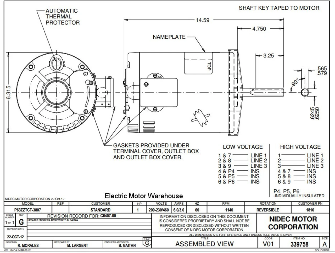 Three Phase Motor. Automatic Overload Protection. Continuous Duty; Rain Shield; Class B Insulation; 60C Ambient Temperature, flat & keyway on shaft. Condenser fan motor. Suggested replacement for Carrier HD52VE214, 5K49N6084S P063TCT3807015B