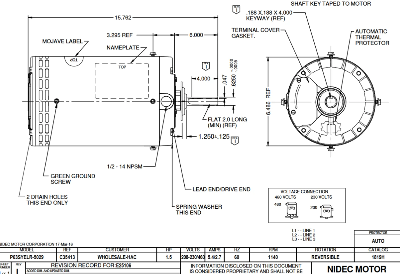 1 1/2 hp 1140 RPM, 5.4/2.7 amps 208-230/460V Volts 60 Hz 3-Phase Motor