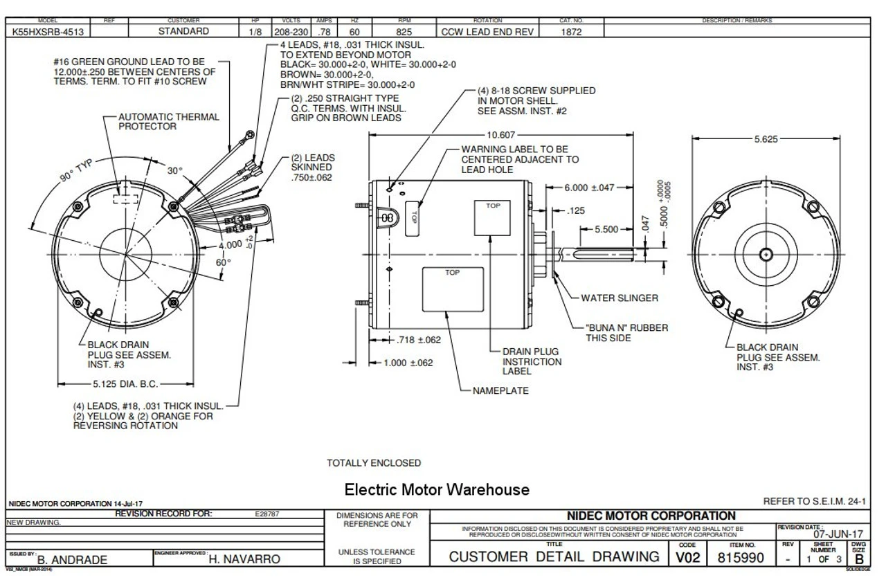 Permanent Split Capacitor Motor. Automatic Overload Protection. Continuous Duty; Totally Enclosed Air Over Enclosure; Class B Insulation; 60C Ambient Temperature; 30″ Leads, K055SRB4513862B