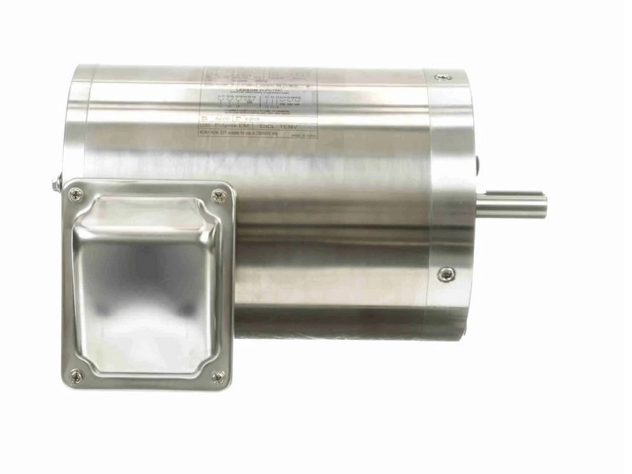 Stainless Steel Wash Duty motor with a C-face mount for use in wet and misty environments. Bolt holes are 3 3/4″ on center measured across the shaft. Wiring diagram on motor name plate. TENV = Totally Enclosed Non-Ventilated.