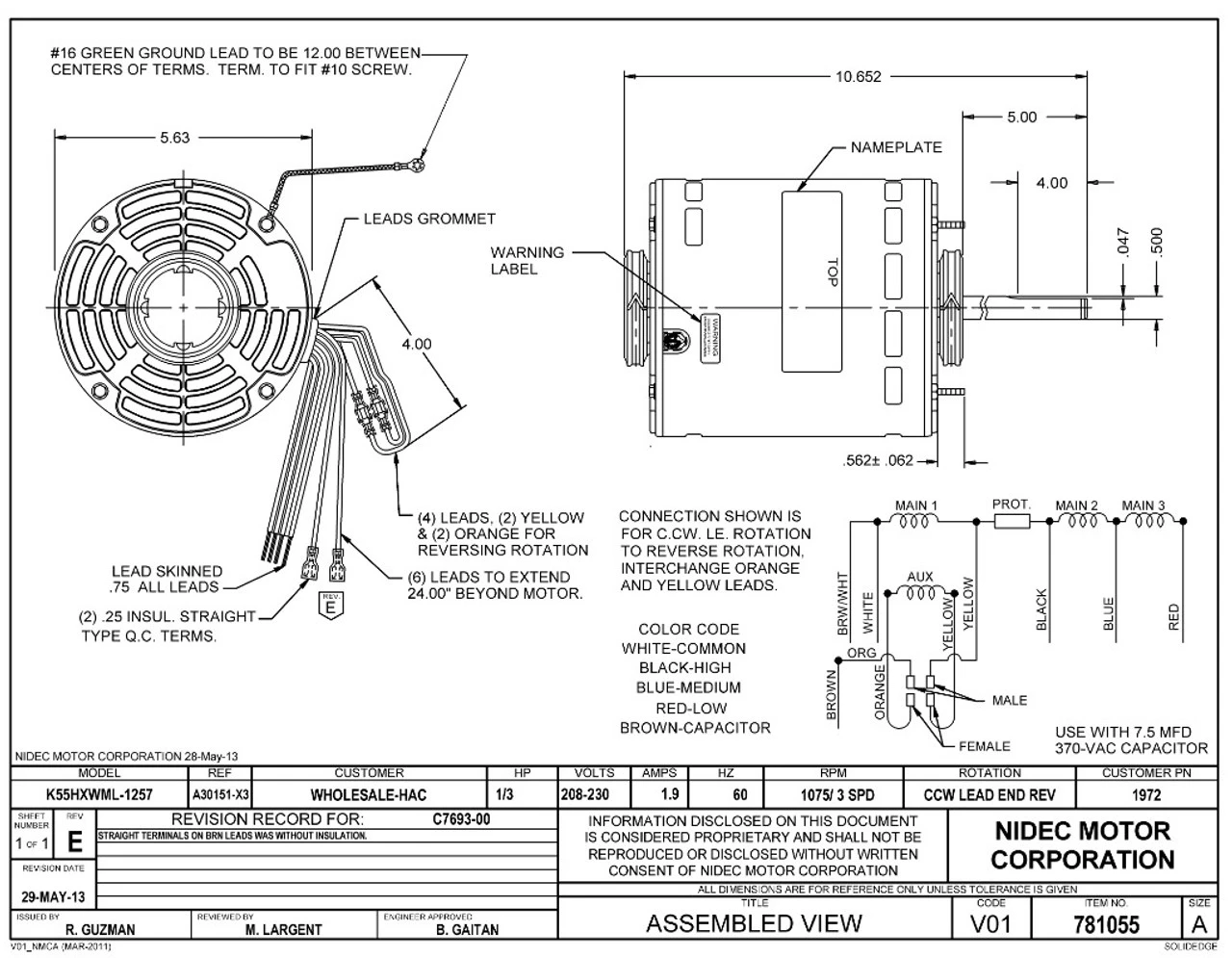 Permanent Split Capacitor Motor. Automatic Overload Protection. Continuous Duty; Open Air Over Enclosure; Class B Insulation; 40C Ambient Temperature; 24″ Leads, 60 Hertz. K055WML1257012B