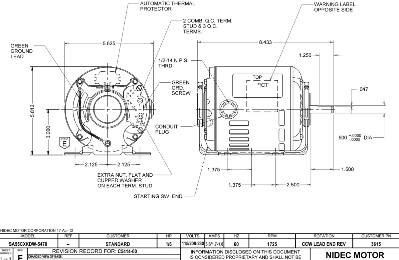 - 1/6 hp 1800 RPM (1 speed), 3.6/1.7-1.8 amps 115/208-230V Volts 60 Hz Split Phase Motor