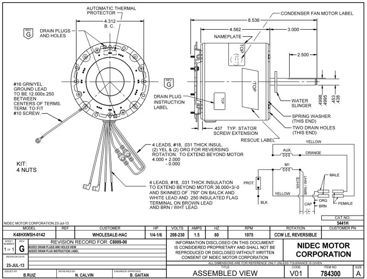 Permanent Split Capacitor Motor. Automatic Overload Protection. Continuous Duty; Totally Enclosed Air Over Enclosure; Class B Insulation; 70C Ambient Temperature; 36″ Leads, 60 Hertz. K048WSH0142012B Application: Outside A.C. Condenser fan motors.
