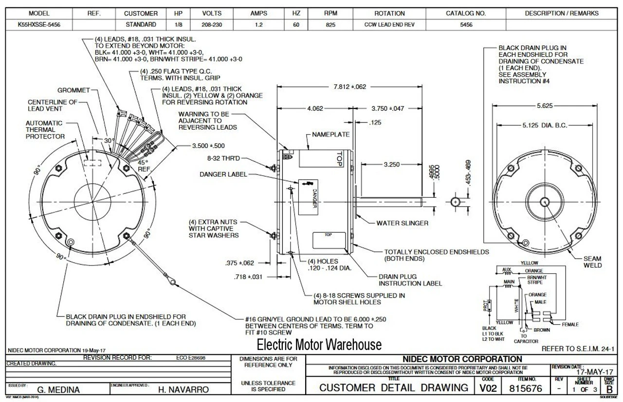 Permanent Split Capacitor Motor. Automatic Overload Protection. Continuous Duty; Totally Enclosed; Class B Insulation; 40C Ambient Temperature; 41″ Leads. Suggested after market replacement for Rheem Condenser fan motor 51-20761-91, K055SSE5456862B.