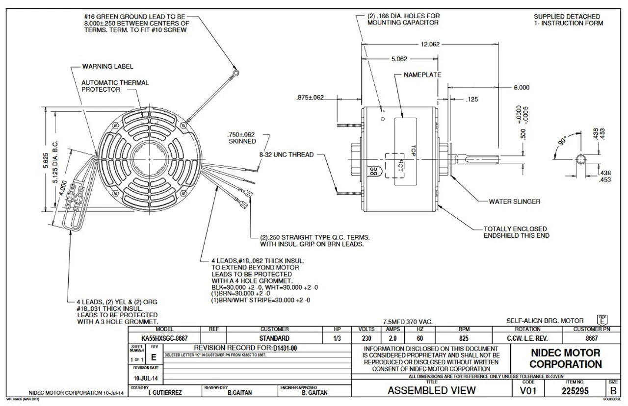Permanent Split Capacitor Motor. Automatic Overload Protection. Continuous Duty; Open Drip-Proof Air Over Enclosure; Class B Insulation; 60C Ambient Temperature; 30″ Leads, KA55SGC8667802B