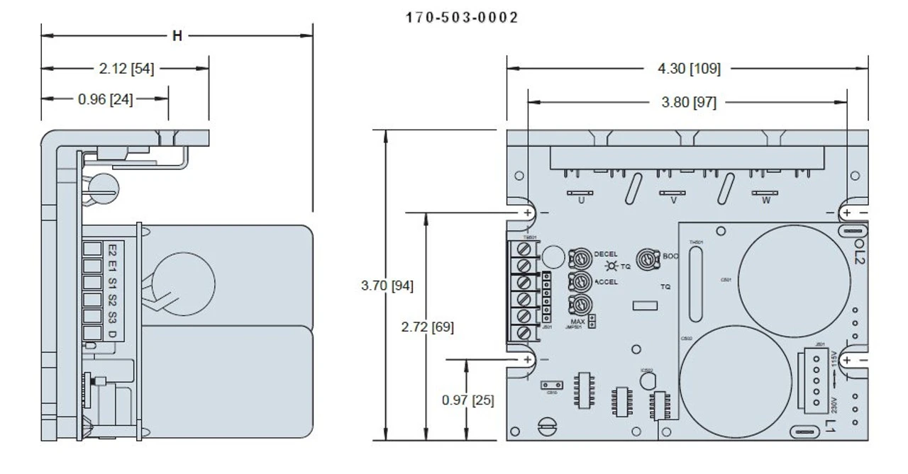 The cost-conscious and compact chassis design of Bison VFD Chassis Drives maintain the industry standard for mounting hole location and the coded LEDs make it easy to visually determine the drive status. With it’s compact design and application flexibility, this is an excellent choice for most AC applications. Easy to Calibrate and Set-up: On board trimmer pot adjustments for boost, maximum speed, acceleration, and deceleration. Torque “Foldback” Feature: Allows up to 200% torque for short periods to overcome intermittent peak loads, then reduces the torque to a preset safe level. Switching Frequency: 16 kHz switching frequency, with option to change between 4 and 16 kHz in the field. A high switching frequency results in quiet motor operation. Adjustments to a lower frequency if desired can be done in the field.