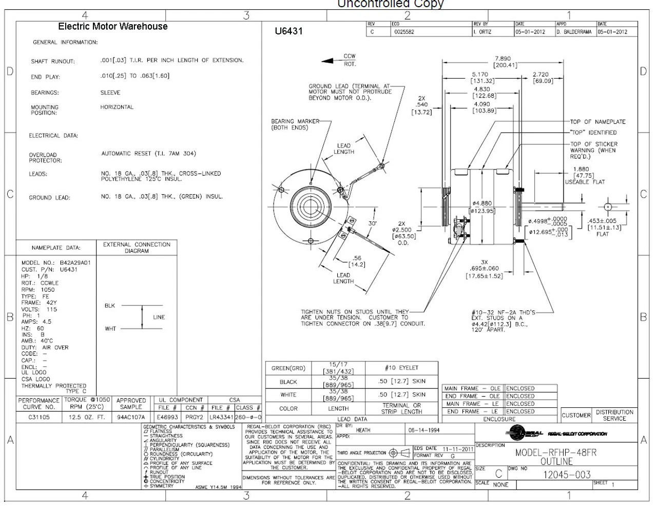 - 1/8 hp 1050 RPM 1-Speed, 4.5 amps, 115V 60hz.